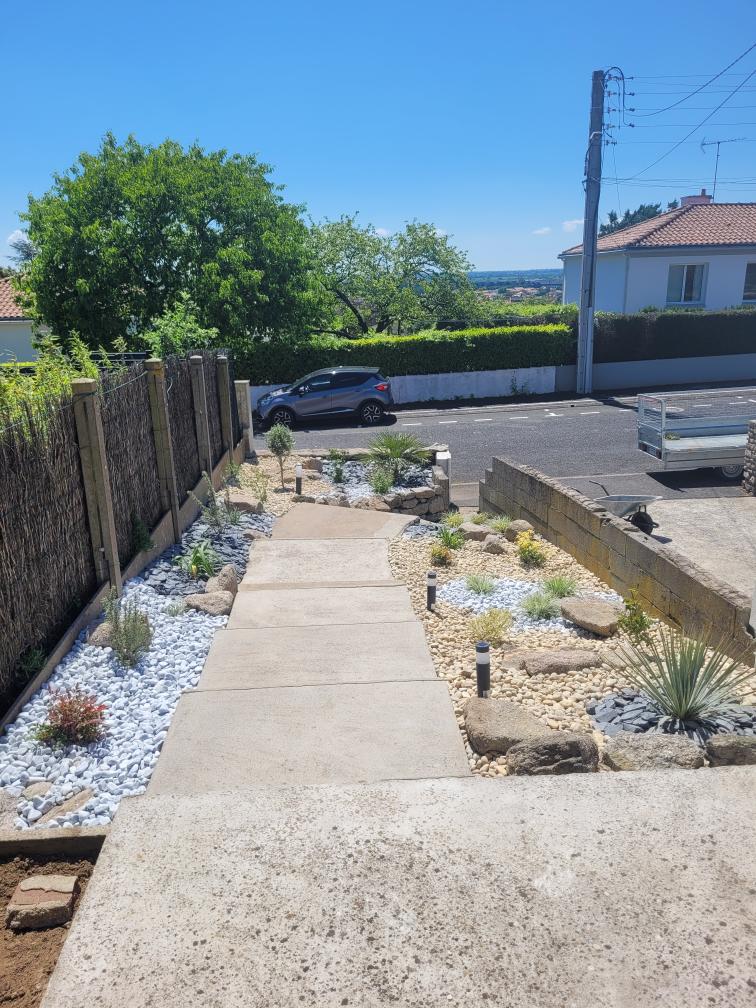 Un cheminement clair, structuré et facile d’entretien. Le contraste entre les matériaux minéraux et la végétation soigneusement choisie créer un rendu moderne et soigné.